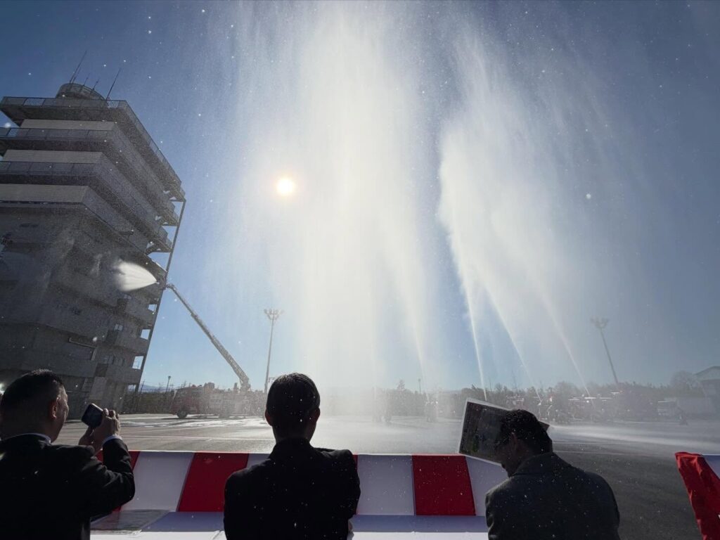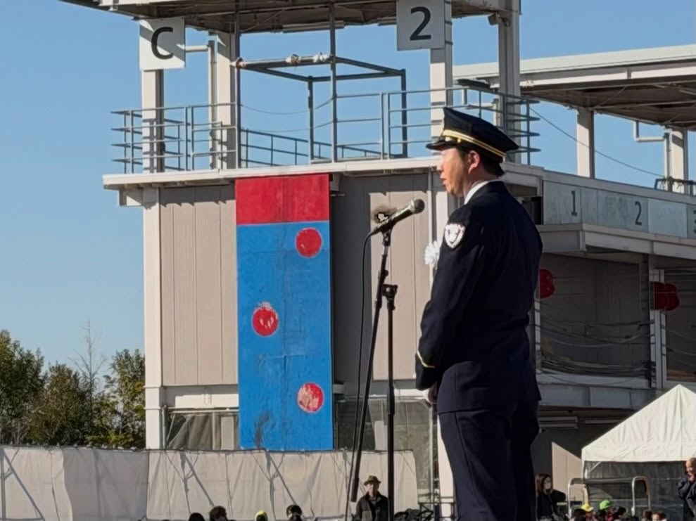 一斉放水の水飛沫が観覧席まで威勢よく飛んできてびしょ濡れになりましたが(苦笑)