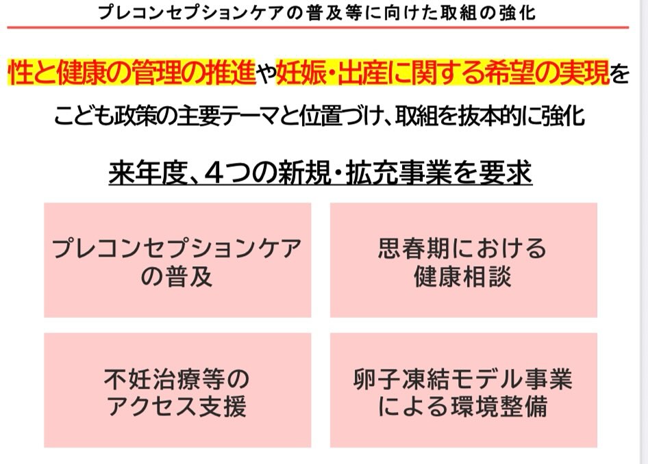 先日、卵子凍結サービスを運営されている会社代表様から、貴重なお話を色々と伺いました。 こども家庭庁がプレコンセプションケア推進に、総額57億円の令和8年度予算要求をしています。 その主な内容は 10都道府県を…